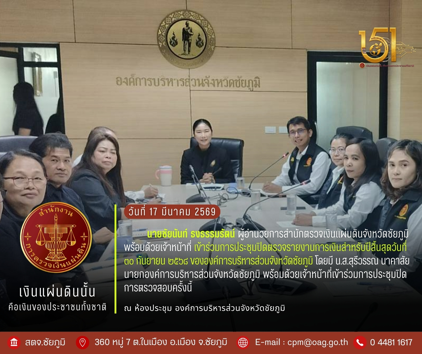 วันอังคารที่ 17 มีนาคม 2569 นายชัยนันท์ ธงธรรมรัตน์ ผู้อำนวยการสำนักตรวจเงินแผ่นดินจังหวัดชัยภูมิ พร้อมด้วยเจ้าหน้าที่ เข้าร่วมประชุมปิดตรวจรายงานการเงินสำหรับปีสิ้นสุดวันที่ 30 กันยายน 2568 ขององค์การบริหารส่วนจังหวัดชัยภูมิ ตามพระราชบัญญัติวินัยการเงินการคลังของรัฐ พ.ศ. 2561 โดย น.ส.สุรีวรรณ นาคาสัย นายกองค์การบริหารส่วนจังหวัด พร้อมด้วยเจ้าหน้าที่เข้าร่วมประชุมปิดการตรวจสอบครั้งนี้ ณ ห้องประชุม องค์การบริหารส่วนจังหวัดชัยภูมิ