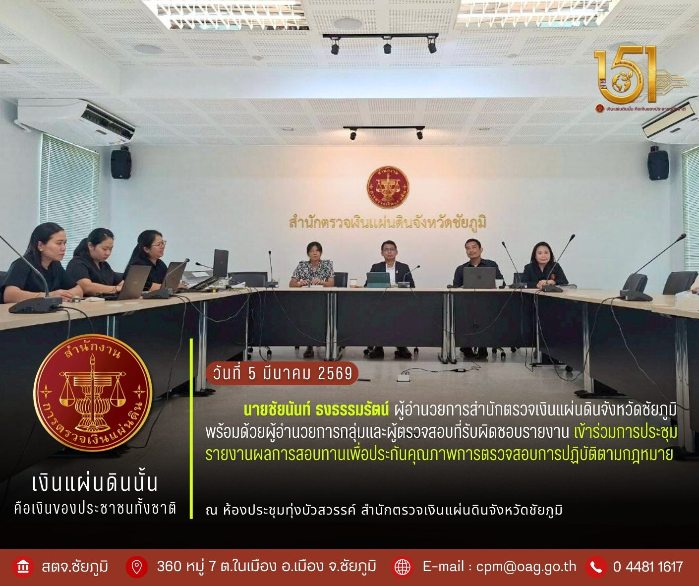 วันพฤหัสบดีที่ 5 มีนาคม 2569 เวลา 9.30 – 12.00 น. นายชัยนันท์ ธงธรรมรัตน์ ผู้อำนวยการสำนักตรวจเงินแผ่นดินจังหวัดชัยภูมิ พร้อมด้วยผู้อำนวยการกลุ่มและผู้ตรวจสอบที่รับผิดชอบรายงาน เข้าร่วมการประชุมรายงานผลการสอบทานเพื่อประกันคุณภาพการตรวจสอบการปฏิบัติตามกฎหมาย ณ ห้องประชุมทุ่งบัวสวรรค์ สำนักตรวจเงินแผ่นดินจังหวัดชัยภูมิ