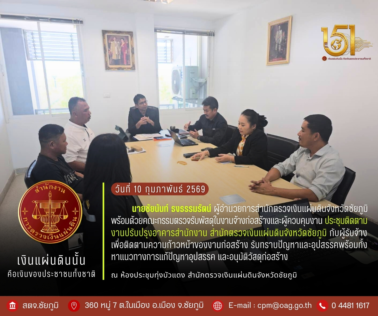 วันอังคารที่ 10 กุมภาพันธ์ 2569 นายชัยนันท์ ธงธรรมรัตน์ ผู้อำนวยการสำนักตรวจเงินแผ่นดินจังหวัดชัยภูมิ พร้อมด้วยคณะกรรมตรวจรับพัสดุในงานจ้างก่อสร้างและผู้ควบคุมงาน ประชุมติดตามงานปรับปรุงอาคารสำนักงาน สำนักตรวจเงินแผ่นดินจังหวัดชัยภูมิ กับผู้รับจ้าง เพื่อติดตามความก้าวหน้าของงานก่อสร้าง รับทราบปัญหาและอุปสรรคพร้อมทั้งหาแนวทางการแก้ปัญหาอุปสรรค และอนุมัติวัสดุก่อสร้าง ณ ห้องประชุมทุ่งบัวแดง สำนักตรวจเงินแผ่นดินจังหวัดชัยภูมิ