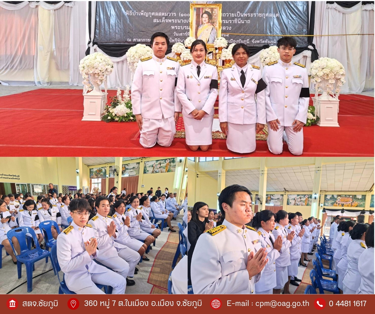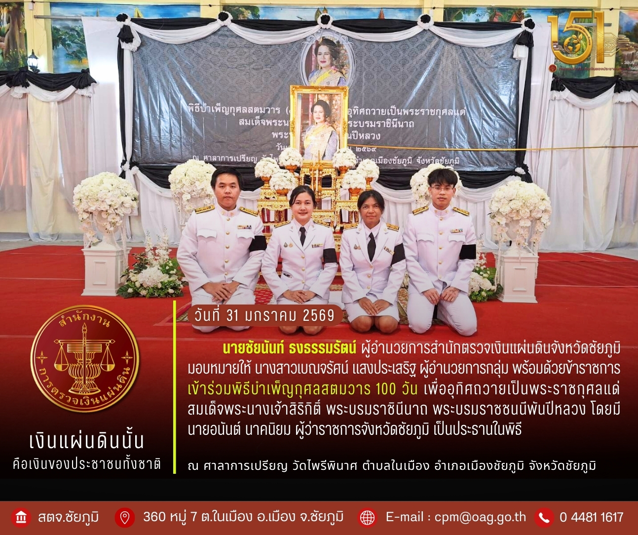 วันเสาร์ที่ 31 มกราคม 2569 เวลา 17.00 น. นายชัยนันท์ ธงธรรมรัตน์ ผู้อำนวยการสำนักตรวจเงินแผ่นดินจังหวัดชัยภูมิ มอบหมายให้ นางสาวเบณจรัศน์ แสงประเสริฐ ผู้อำนวยการกลุ่ม พร้อมด้วยข้าราชการ เข้าร่วมพิธีบำเพ็ญกุศลสตมวาร 100 วัน เพื่ออุทิศถวายเป็นพระราชกุศลแด่ สมเด็จพระนางเจ้าสิริกิติ์ พระบรมราชินีนาถ พระบรมราชชนนีพันปีหลวง โดยมี นายอนันต์ นาคนิยม ผู้ว่าราชการจังหวัดชัยภูมิ เป็นประธานในพิธี ณ ศาลาการเปรียญ วัดไพรีพินาศ ตำบลในเมือง อำเภอเมืองชัยภูมิ จังหวัดชัยภูมิ