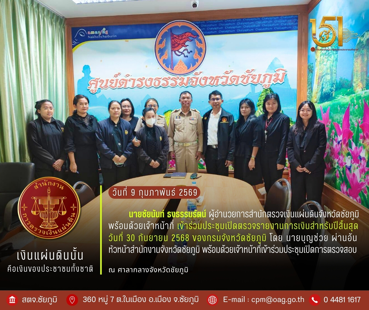 วันจันทร์ที่ 9 กุมภาพันธ์ 2569 นายชัยนันท์ ธงธรรมรัตน์ ผู้อำนวยการสำนักตรวจเงินแผ่นดินจังหวัดชัยภูมิ พร้อมด้วยเจ้าหน้าที่ เข้าร่วมประชุมเปิดตรวจรายงานการเงินสำหรับปีสิ้นสุดวันที่ 30 กันยายน 2569 ของกรมจังหวัดชัยภูมิ ตามพระราชบัญญัติประกอบรัฐธรรมนูญว่าด้วยการตรวจเงินแผ่นดิน พ.ศ. 2561 โดย นายบุญช่วย ผ่านอ้น หัวหน้าสำนักงานจังหวัดชัยภูมิ พร้อมด้วยเจ้าหน้าที่เข้าร่วมประชุมเปิดการตรวจสอบครั้งนี้ โดยมีวัตถุประสงค์เพื่อชี้แจงขอบเขต และแนวทางการตรวจสอบ พร้อมทั้งติดตามปัญหาอุปสรรคจากการตรวจสอบ ณ ศาลากลางจังหวัดชัยภูมิ