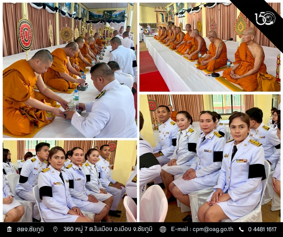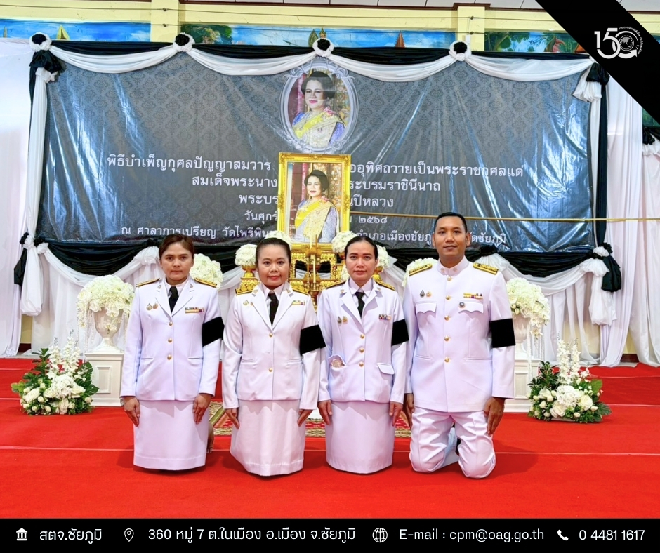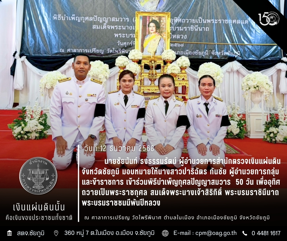 วันศุกร์ที่ 12 ธันวาคม 2568 เวลา 17.00 น. นายชัยนันท์ ธงธรรมรัตน์ ผู้อำนวยการสำนักตรวจเงินแผ่นดินจังหวัดชัยภูมิ มอบหมายให้นางสาวปาริฉัตร กันชัย ผู้อำนวยการกลุ่ม และข้าราชการเข้าร่วม พิธีบำเพ็ญกุศลปัญญาสมวาร 50 วัน เพื่ออุทิศถวายเป็นพระราชกุศล สมเด็จพระนางเจ้าสิริกิติ์พระบรมราชินีนาถ พระบรมราชชนนีพันปีหลวง โดยมีนายอนันต์ นาคนิยม ผู้ว่าราชการจังหวัดชัยภูมิ เป็นประธานในพิธี ณ ศาลาการเปรียญ วัดไพรีพินาศ ตำบลในเมือง อำเภอเมืองชัยภูมิ จังหวัดชัยภูมิ